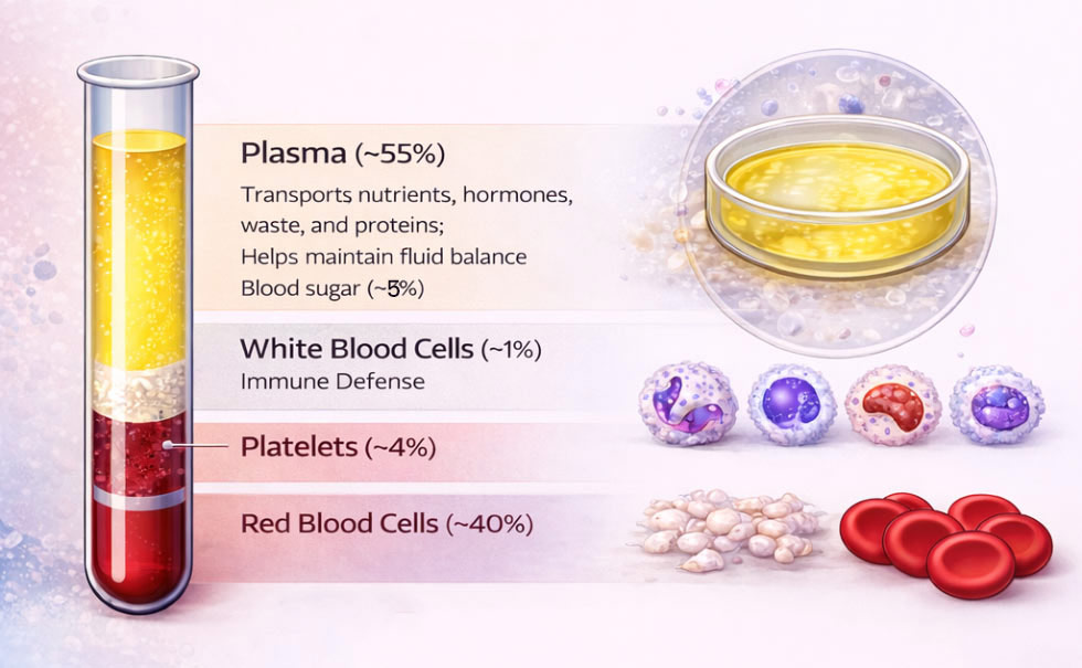 Blood is a specialized connective tissue and a circulating body fluid that supports almost every organ system. It functions as a transport medium, a defense system, and a regulator of internal conditions (homeostasis). In humans, blood is typically described as having four main components: plasma, red blood cells (RBCs), white blood cells (WBCs), and platelets.